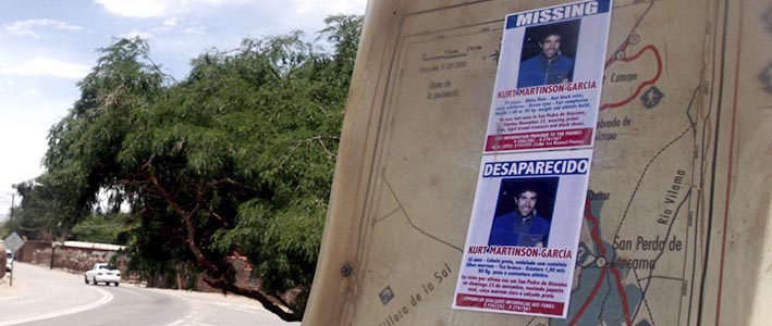 Se presenta una denuncia por presunta desgracia de Kurt Glenn Martinson García, de 35 años, cuyo paradero se desconoce desde el 24 de noviembre, cuando salió de su casa sin especificar su destino. Martinson, quien trabaja como guía turístico en San Pedro de Atacama, es hermano del fiscal de Las Condes, Paul Martinson.